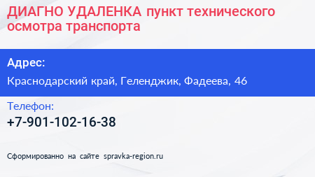 ДИАГНО-УДАЛЕНКА, пункт технического осмотра транспорта по адресу Краснодарский край, Геленджик, Фадеева, 46 в дальнейшем Организация, размещена в следующих категориях: