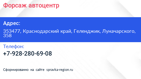 Форсаж, автоцентр по адресу 353477, Краснодарский край, Геленджик, Луначарского, 358 в дальнейшем Организация, размещена в следующих категориях: