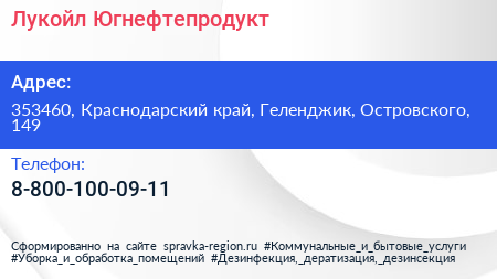 Лукойл-Югнефтепродукт по адресу 353460, Краснодарский край, Геленджик, Островского, 149 в дальнейшем Организация, размещена в следующих категориях: