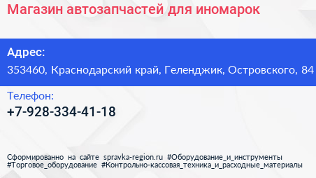Магазин автозапчастей для иномарок по адресу 353460, Краснодарский край, Геленджик, Островского, 84 в дальнейшем Организация, размещена в следующих категориях: