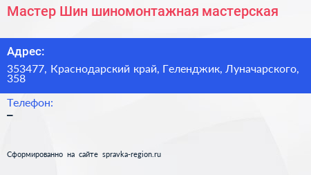 Мастер Шин, шиномонтажная мастерская по адресу 353477, Краснодарский край, Геленджик, Луначарского, 358 в дальнейшем Организация, размещена в следующих категориях: