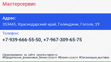Мастерсервис по адресу 353465, Краснодарский край, Геленджик, Гоголя, 19 в дальнейшем Организация, размещена в следующих категориях:
