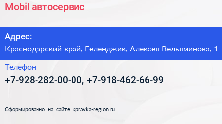 Mobil, автосервис по адресу Краснодарский край, Геленджик, Алексея Вельяминова, 1 в дальнейшем Организация, размещена в следующих категориях: