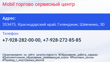 Mobil, торгово-сервисный центр по адресу 353475, Краснодарский край, Геленджик, Шевченко, 30 в дальнейшем Организация, размещена в следующих категориях: