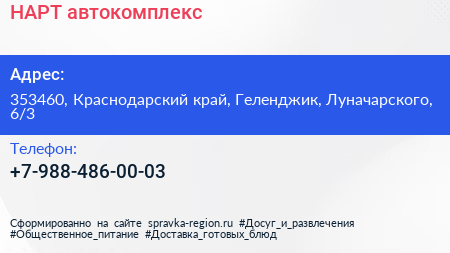 НАРТ, автокомплекс по адресу 353460, Краснодарский край, Геленджик, Луначарского, 6/3 в дальнейшем Организация, размещена в следующих категориях: