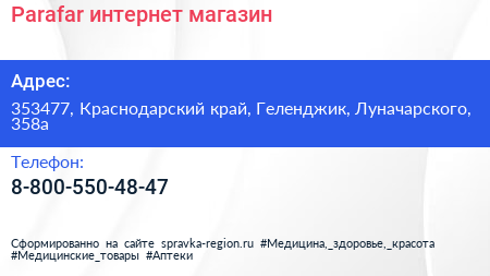 Parafar, интернет-магазин по адресу 353477, Краснодарский край, Геленджик, Луначарского, 358а в дальнейшем Организация, размещена в следующих категориях: