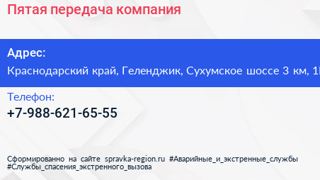 Пятая передача, компания по адресу Краснодарский край, Геленджик, Сухумское шоссе 3 км, 1Б в дальнейшем Организация, размещена в следующих категориях: