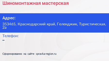 Шиномонтажная мастерская по адресу 353465, Краснодарский край, Геленджик, Туристическая, 2а в дальнейшем Организация, размещена в следующих категориях: