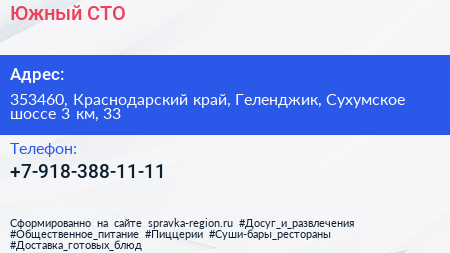 Южный, СТО по адресу 353460, Краснодарский край, Геленджик, Сухумское шоссе 3 км, 33 в дальнейшем Организация, размещена в следующих категориях: