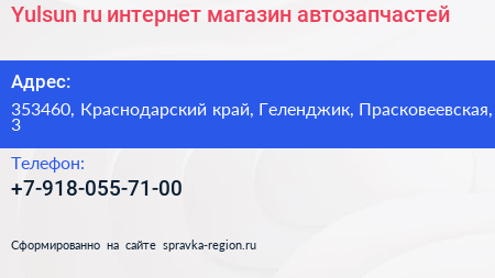 Yulsun.ru, интернет-магазин автозапчастей по адресу 353460, Краснодарский край, Геленджик, Прасковеевская, 3 в дальнейшем Организация, размещена в следующих категориях: