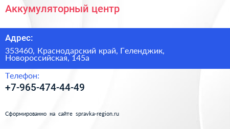 Аккумуляторный центр по адресу 353460, Краснодарский край, Геленджик, Новороссийская, 145а в дальнейшем Организация, размещена в следующих категориях: