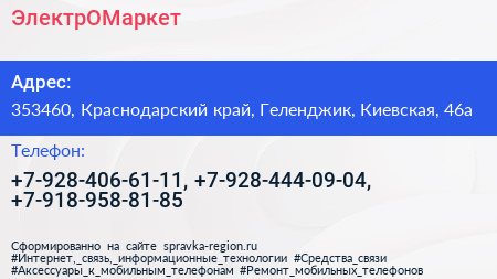 ЭлектрОМаркет по адресу 353460, Краснодарский край, Геленджик, Киевская, 46а в дальнейшем Организация, размещена в следующих категориях: