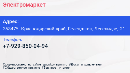 Электромаркет по адресу 353475, Краснодарский край, Геленджик, Леселидзе, 21 в дальнейшем Организация, размещена в следующих категориях: