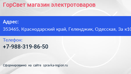 ГорСвет, магазин электротоваров по адресу 353465, Краснодарский край, Геленджик, Одесская, 3а к10 в дальнейшем Организация, размещена в следующих категориях:
