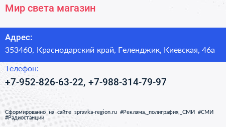 Мир света, магазин по адресу 353460, Краснодарский край, Геленджик, Киевская, 46а в дальнейшем Организация, размещена в следующих категориях: