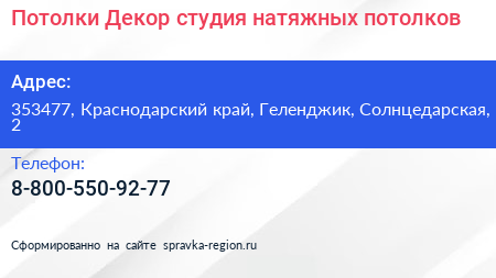 Потолки-Декор, студия натяжных потолков по адресу 353477, Краснодарский край, Геленджик, Солнцедарская, 2 в дальнейшем Организация, размещена в следующих категориях: