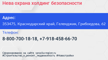 Нева-охрана, холдинг безопасности по адресу 353475, Краснодарский край, Геленджик, Грибоедова, 62 в дальнейшем Организация, размещена в следующих категориях: