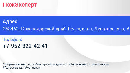 ПожЭксперт по адресу 353460, Краснодарский край, Геленджик, Луначарского, 6 в дальнейшем Организация, размещена в следующих категориях: