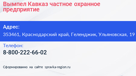 Вымпел-Кавказ, частное охранное предприятие по адресу 353461, Краснодарский край, Геленджик, Ульяновская, 19 в дальнейшем Организация, размещена в следующих категориях: