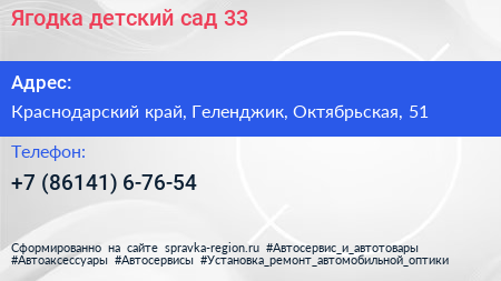 Ягодка, детский сад №33 по адресу Краснодарский край, Геленджик, Октябрьская, 51 в дальнейшем Организация, размещена в следующих категориях: