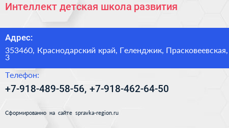 Интеллект, детская школа развития по адресу 353460, Краснодарский край, Геленджик, Прасковеевская, 3 в дальнейшем Организация, размещена в следующих категориях: