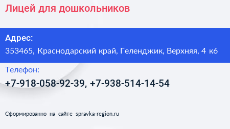 Лицей для дошкольников по адресу 353465, Краснодарский край, Геленджик, Верхняя, 4 к6 в дальнейшем Организация, размещена в следующих категориях: