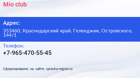 Mio club по адресу 353460, Краснодарский край, Геленджик, Островского, 144/1 в дальнейшем Организация, размещена в следующих категориях: