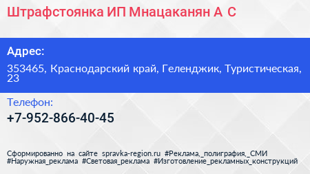 Штрафстоянка, ИП Мнацаканян А.С. по адресу 353465, Краснодарский край, Геленджик, Туристическая, 23 в дальнейшем Организация, размещена в следующих категориях:
