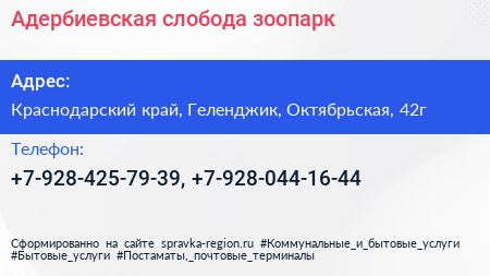 Адербиевская слобода, зоопарк по адресу Краснодарский край, Геленджик, Октябрьская, 42г в дальнейшем Организация, размещена в следующих категориях: