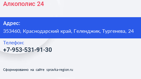 Алкополис 24 по адресу 353460, Краснодарский край, Геленджик, Тургенева, 24 в дальнейшем Организация, размещена в следующих категориях: