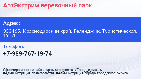 АртЭкстрим, веревочный парк по адресу 353465, Краснодарский край, Геленджик, Туристическая, 19 к1 в дальнейшем Организация, размещена в следующих категориях: