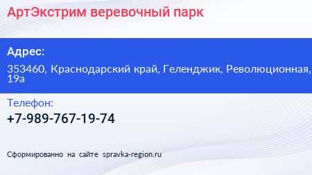 АртЭкстрим, веревочный парк по адресу 353460, Краснодарский край, Геленджик, Революционная, 19а в дальнейшем Организация, размещена в следующих категориях: