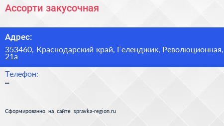 Ассорти, закусочная по адресу 353460, Краснодарский край, Геленджик, Революционная, 21а в дальнейшем Организация, размещена в следующих категориях: