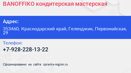 BANOFFIKO, кондитерская мастерская по адресу 353460, Краснодарский край, Геленджик, Первомайская, 29 в дальнейшем Организация, размещена в следующих категориях: