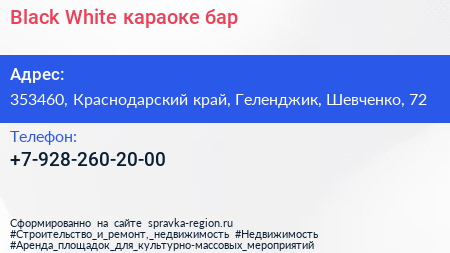 Black & White, караоке-бар по адресу 353460, Краснодарский край, Геленджик, Шевченко, 72 в дальнейшем Организация, размещена в следующих категориях:
