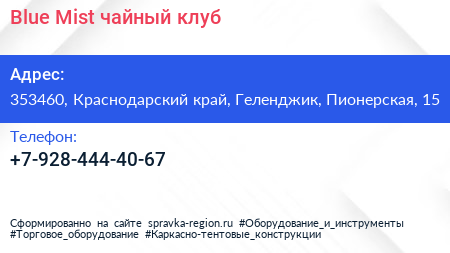 Blue Mist, чайный клуб по адресу 353460, Краснодарский край, Геленджик, Пионерская, 15 в дальнейшем Организация, размещена в следующих категориях: