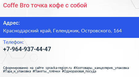 Coffe?Bro, точка кофе с собой по адресу Краснодарский край, Геленджик, Островского, 164 в дальнейшем Организация, размещена в следующих категориях: