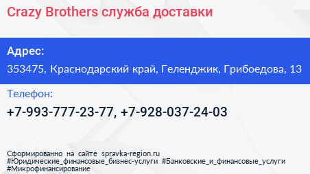 Crazy Brothers, служба доставки по адресу 353475, Краснодарский край, Геленджик, Грибоедова, 13 в дальнейшем Организация, размещена в следующих категориях: