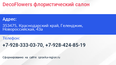 DecoFlowers, флористический салон по адресу 353475, Краснодарский край, Геленджик, Новороссийская, 43а в дальнейшем Организация, размещена в следующих категориях: