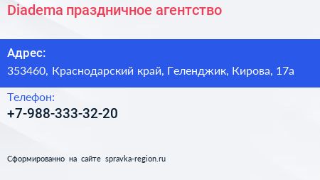Diadema, праздничное агентство по адресу 353460, Краснодарский край, Геленджик, Кирова, 17а в дальнейшем Организация, размещена в следующих категориях: