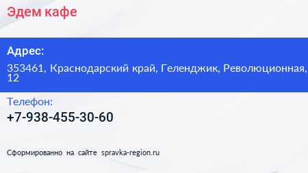 Эдем, кафе по адресу 353461, Краснодарский край, Геленджик, Революционная, 12 в дальнейшем Организация, размещена в следующих категориях: