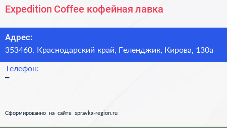 Expedition Coffee, кофейная лавка по адресу 353460, Краснодарский край, Геленджик, Кирова, 130а в дальнейшем Организация, размещена в следующих категориях: