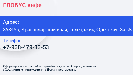 ГЛОБУС, кафе по адресу 353465, Краснодарский край, Геленджик, Одесская, 3а к8 в дальнейшем Организация, размещена в следующих категориях: