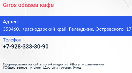 Giros odissea, кафе по адресу 353460, Краснодарский край, Геленджик, Островского, 17 в дальнейшем Организация, размещена в следующих категориях: