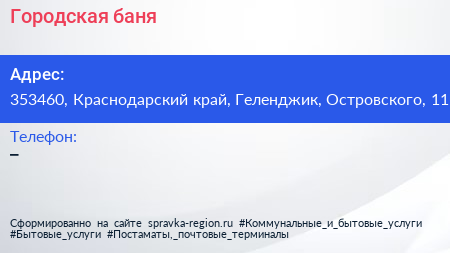 Городская баня по адресу 353460, Краснодарский край, Геленджик, Островского, 11 в дальнейшем Организация, размещена в следующих категориях: