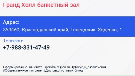 Гранд Холл, банкетный зал по адресу 353460, Краснодарский край, Геленджик, Ходенко, 1 в дальнейшем Организация, размещена в следующих категориях: