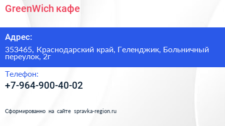 GreenWich, кафе по адресу 353465, Краснодарский край, Геленджик, Больничный переулок, 2г в дальнейшем Организация, размещена в следующих категориях:
