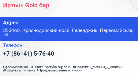 Иртыш Gold, бар по адресу 353460, Краснодарский край, Геленджик, Первомайская, 59 в дальнейшем Организация, размещена в следующих категориях: