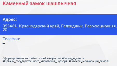Каменный замок, шашлычная по адресу 353461, Краснодарский край, Геленджик, Революционная, 20 в дальнейшем Организация, размещена в следующих категориях: