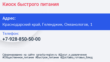 Киоск быстрого питания по адресу Краснодарский край, Геленджик, Океанологов, 1 в дальнейшем Организация, размещена в следующих категориях: